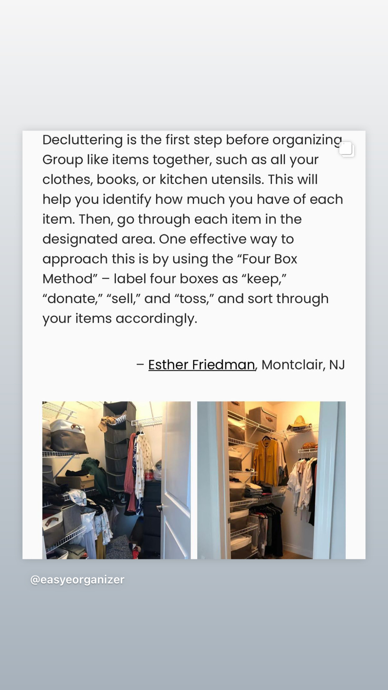 “Esther was amazing, she helped me so much by unpacking and organizing my closet. I had such a relief seeing the gorgeous work she did for me. ”